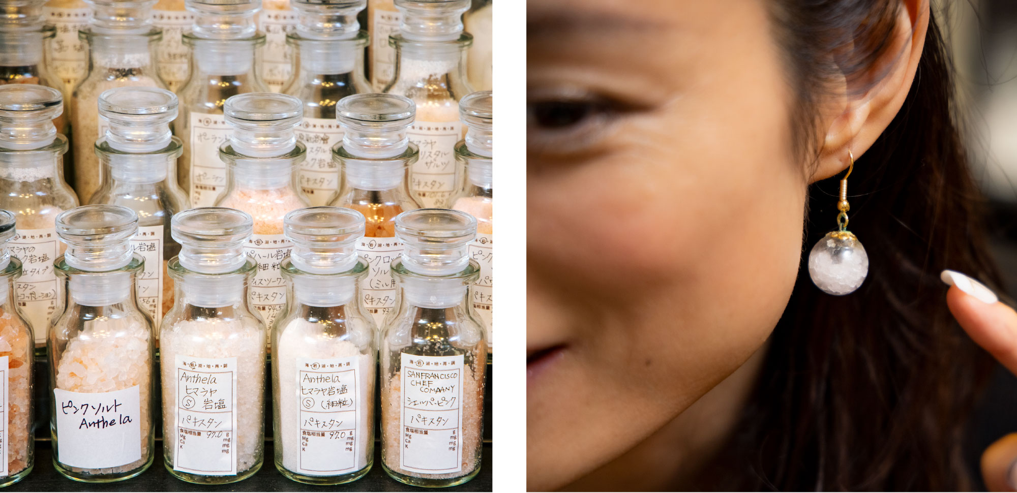 青山さんのお仕事場にある塩は色・形も様々。全部で約2000種もあるそう。お守り代わりにピアスにしたりと使い方もいろいろ。