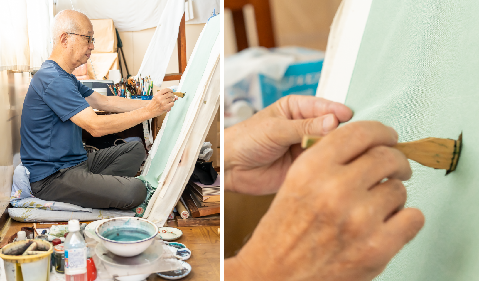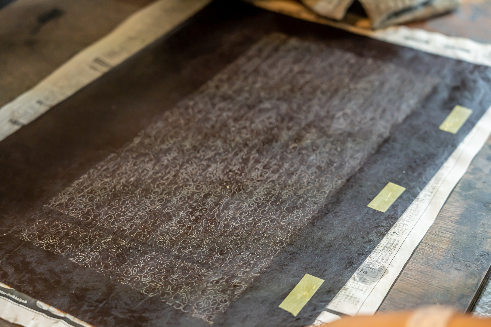 父・幸生さんが「地色直し」の作業をしているところ。地色に合わせた染料を塗り、型紙のつなぎ目やムラを目立たなくさせます。