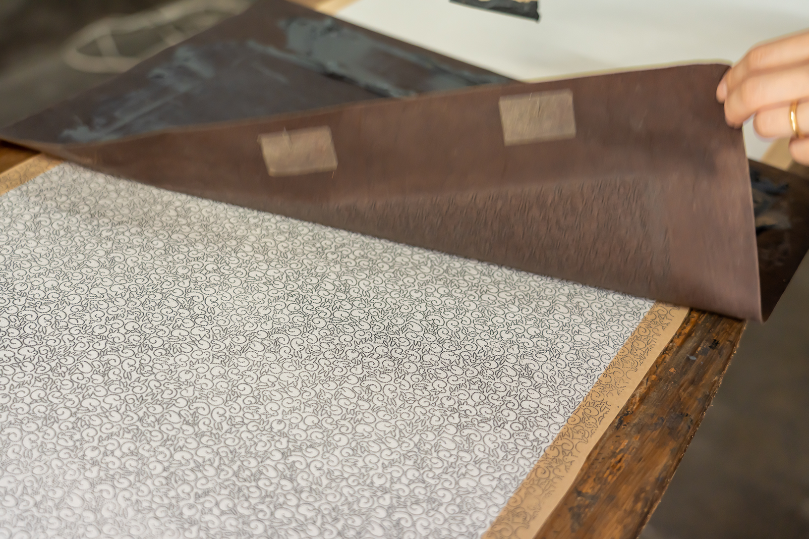 生地に伊勢型紙を置き、駒で防染糊(ぼうせんのり)を置く「型付け」作業。柄の継ぎ目を合わせるのも難しく、一反型付けするのに型紙送りを数十回繰り返します。