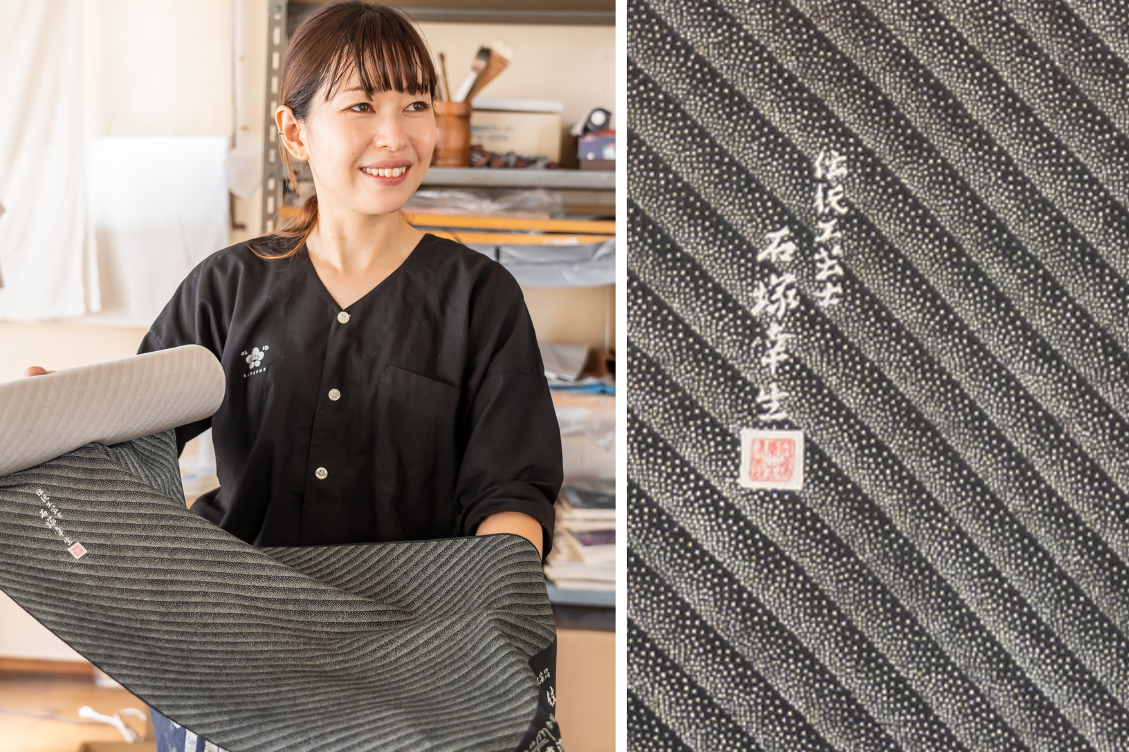 明治23年創業の石塚染工の五代目。女子美術大学で日本画を学び、卒業後はアパレル会社に就職。ファッション好きで2年間接客した経験が、今の仕事に生きているそう。SNSを活用し、伝統工芸の魅力を積極的に発信。二児の母でもあり、職人と家庭を両立している。