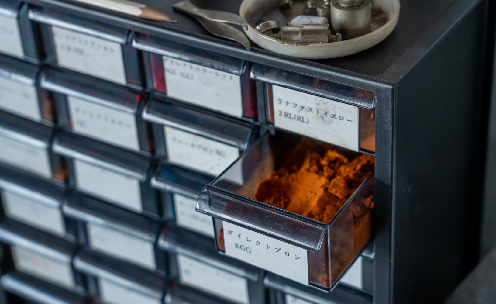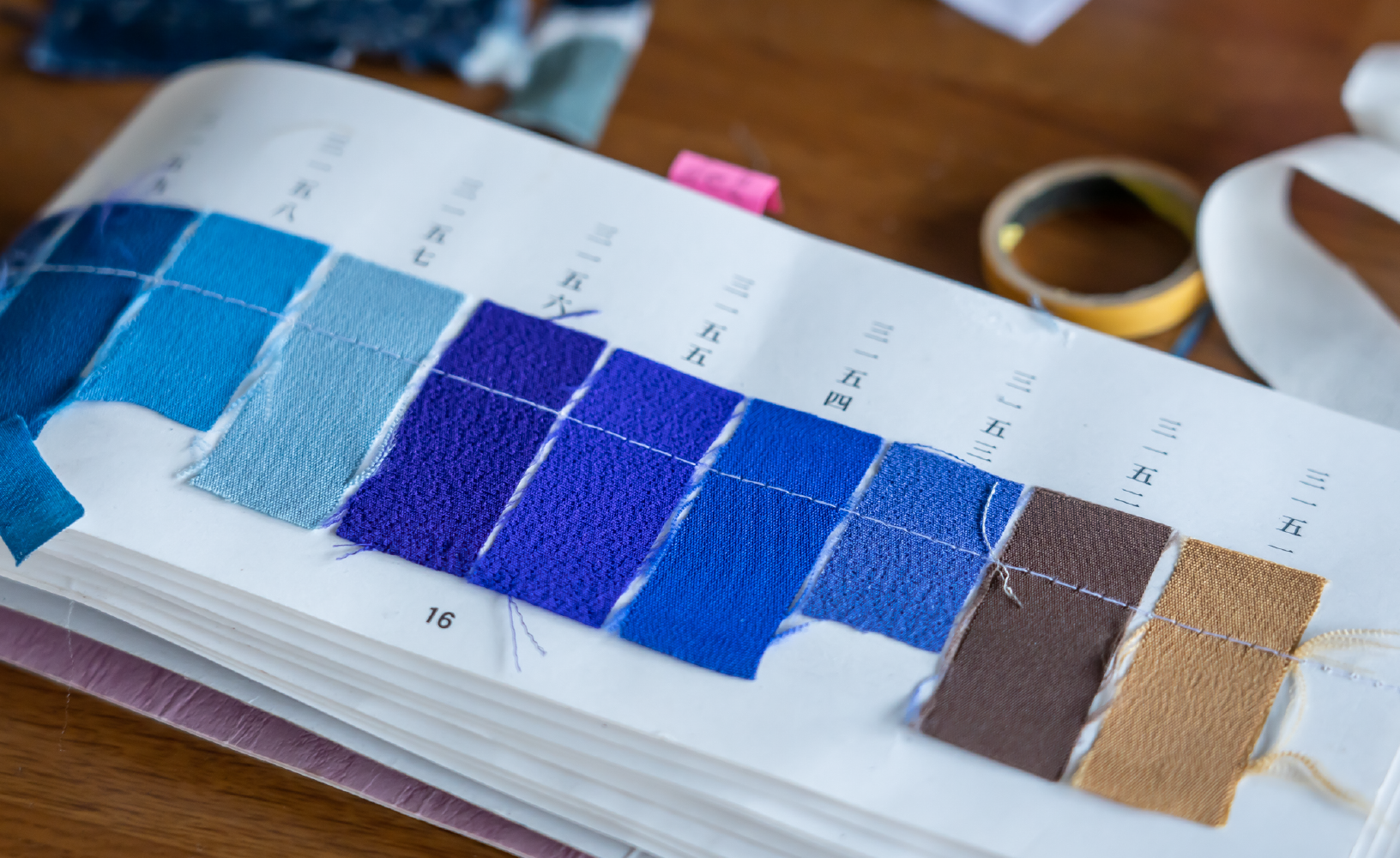 新しい色を作るときは、染料の配合を記した過去の色見本からイメージに近い色を探し、そこから微調整していく。