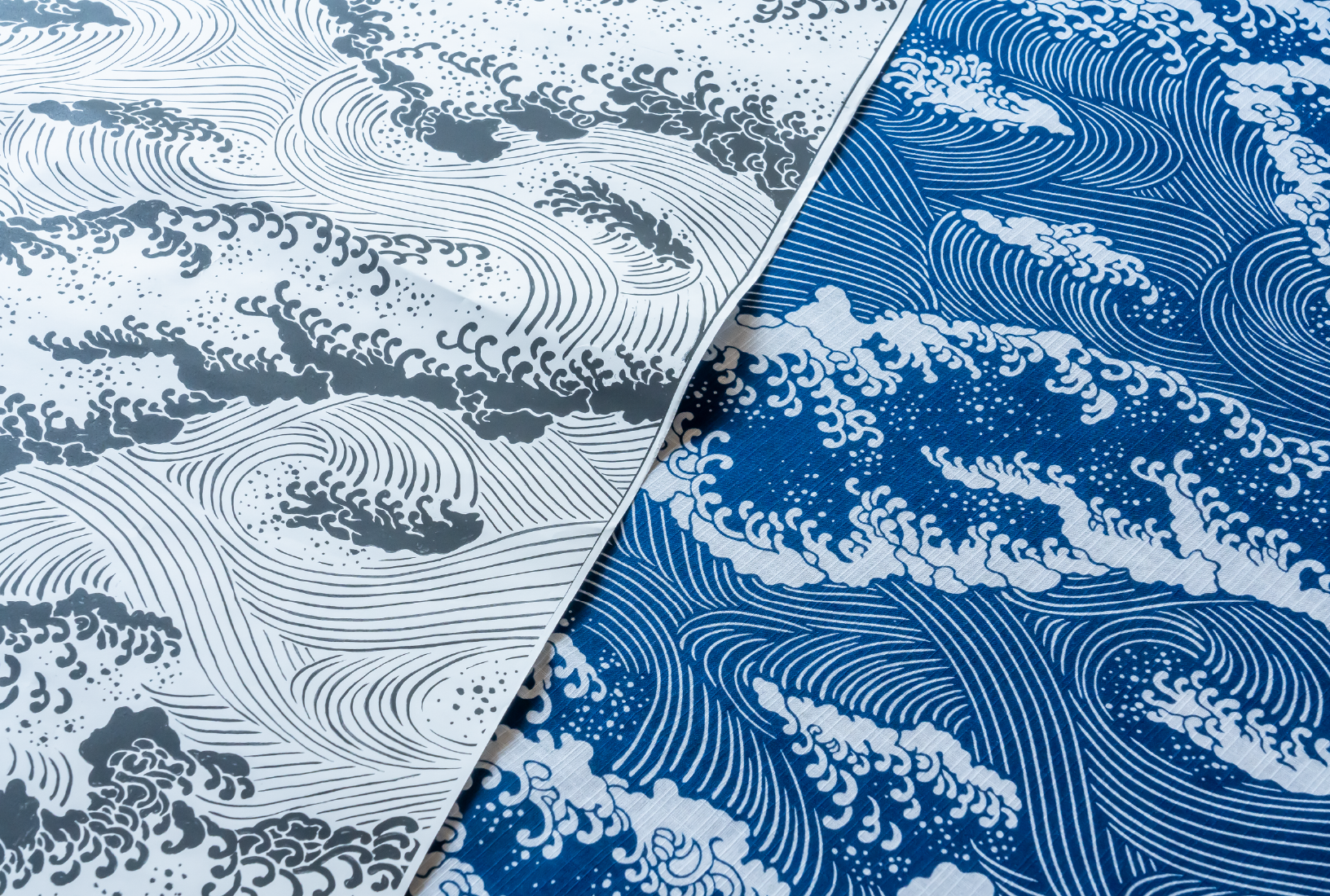 江戸小紋以外の染め物も手掛けています。写真は久美子さんオリジナルの柄「千波万波(せんぱばんぱ)」。日本画の経験を生かし、自身で図案を作成。伊勢型紙の職人に型紙を作ってもらいました。